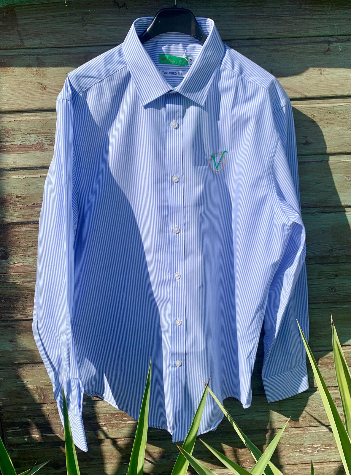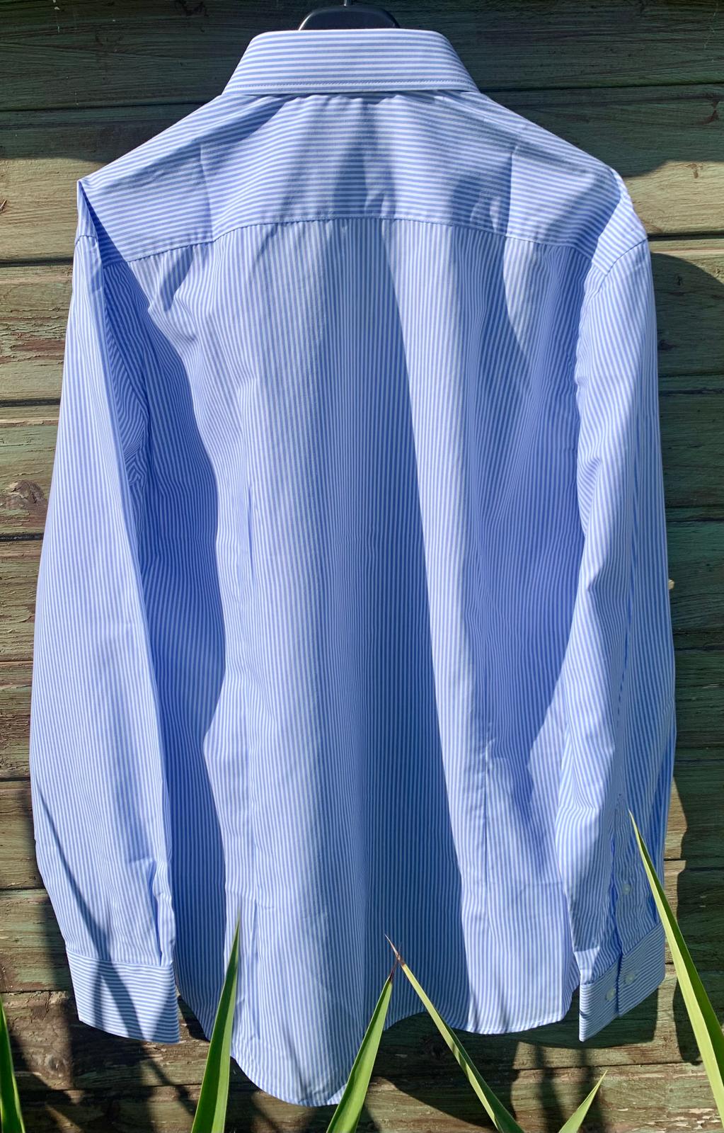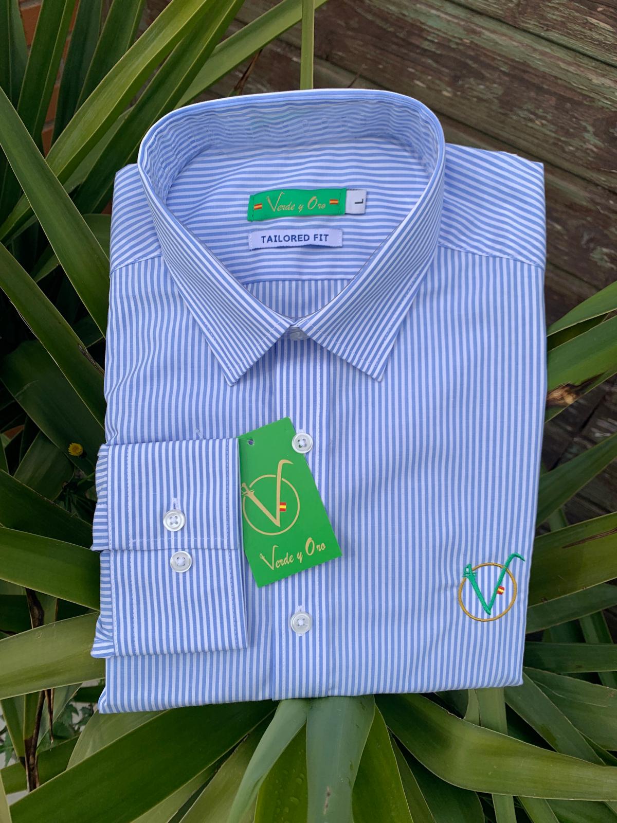 Camisa clásica de caballero de rayas en azul, con cuello sin botones y sin bolsillo delantero. Entallada.