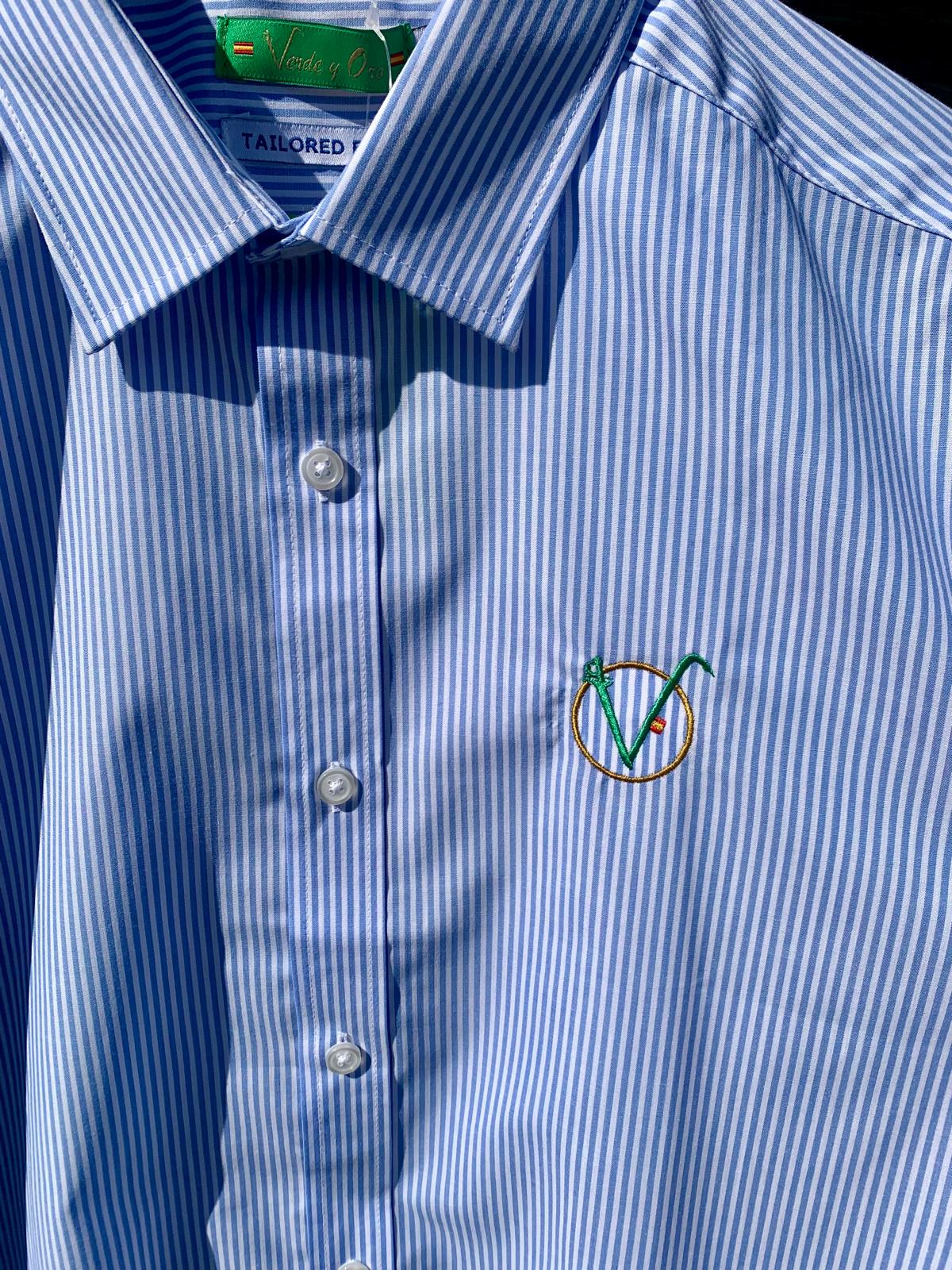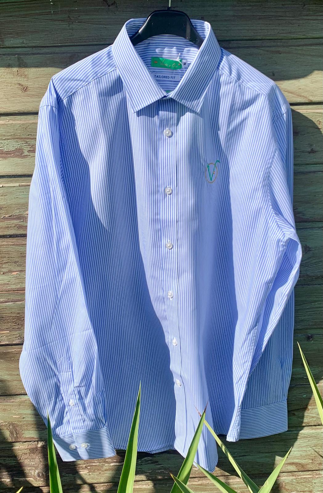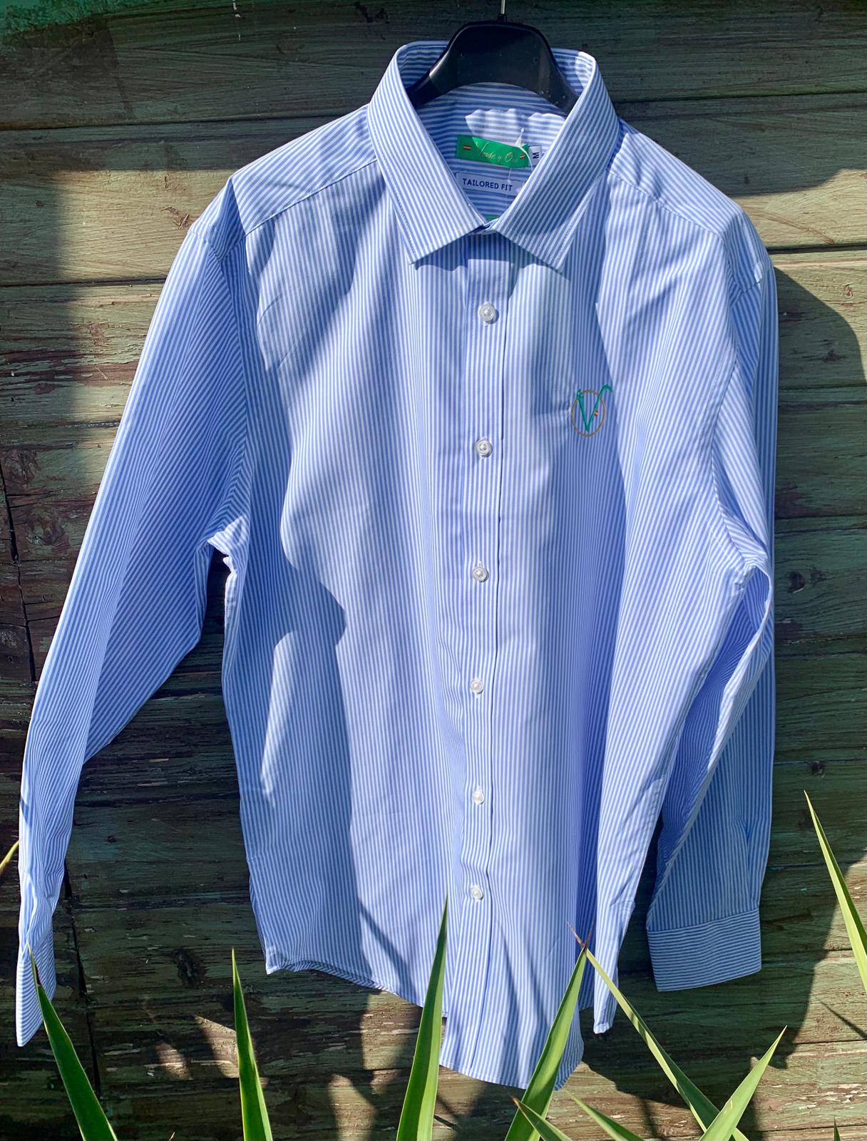 Camisa clásica de caballero de rayas en azul, con cuello sin botones y sin bolsillo delantero. Entallada.