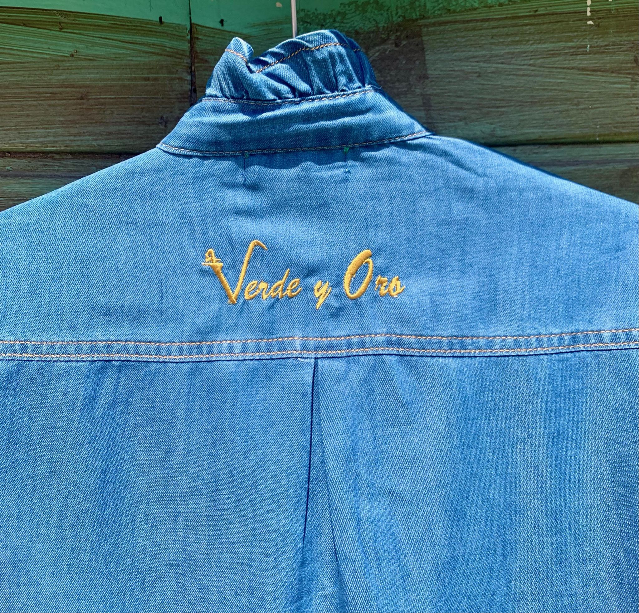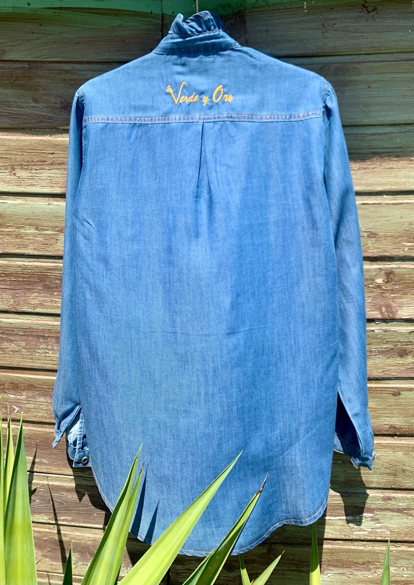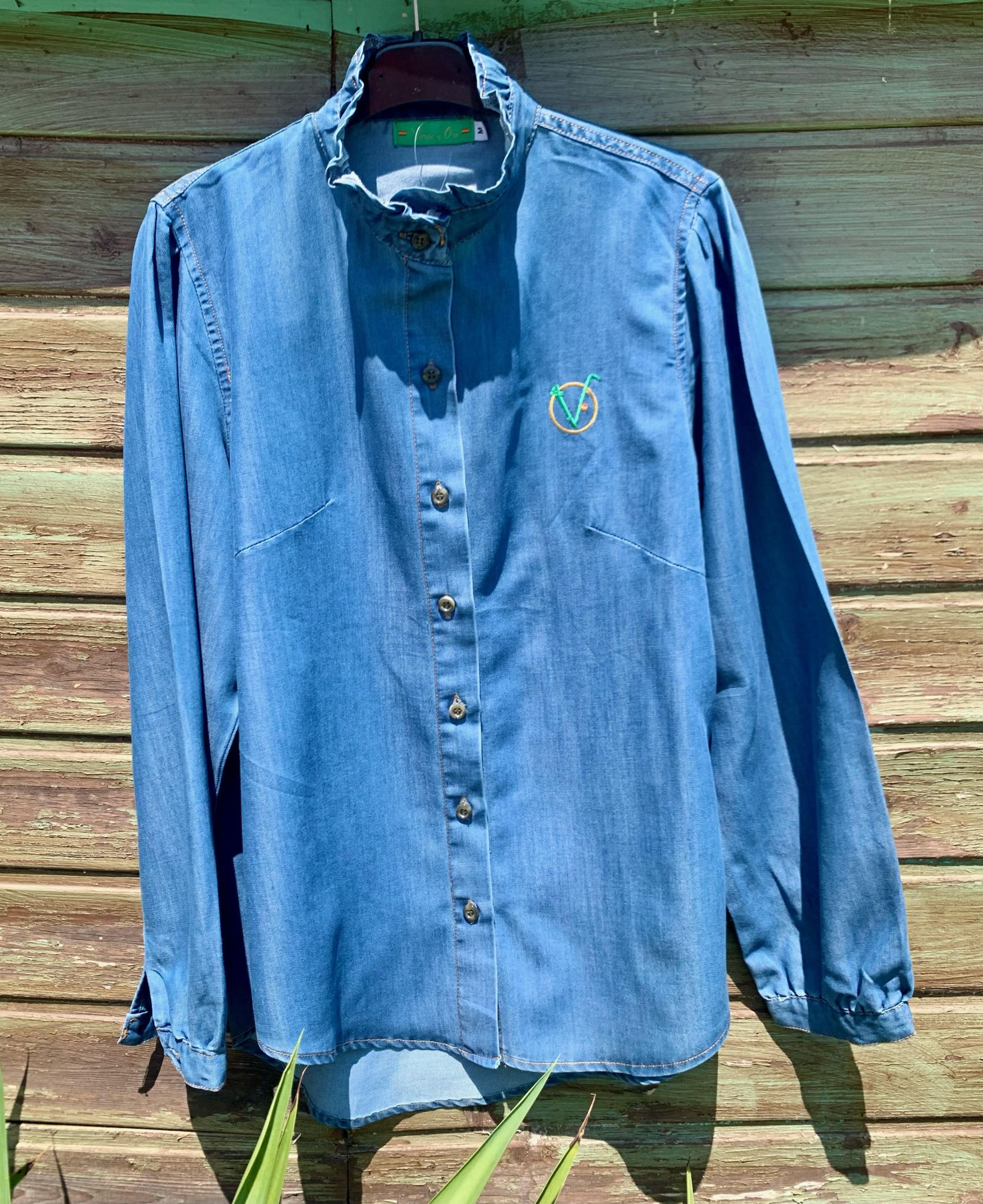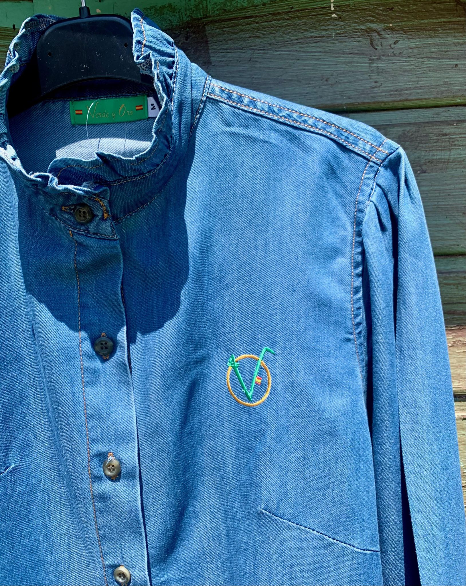 Camisa vaquera o denim, con logo bordado en el pecho y en la parte alta de la espalda. Cuello con terminacion en volante. Muy cómoda ya que es de tela fina con un poquito de elástico.