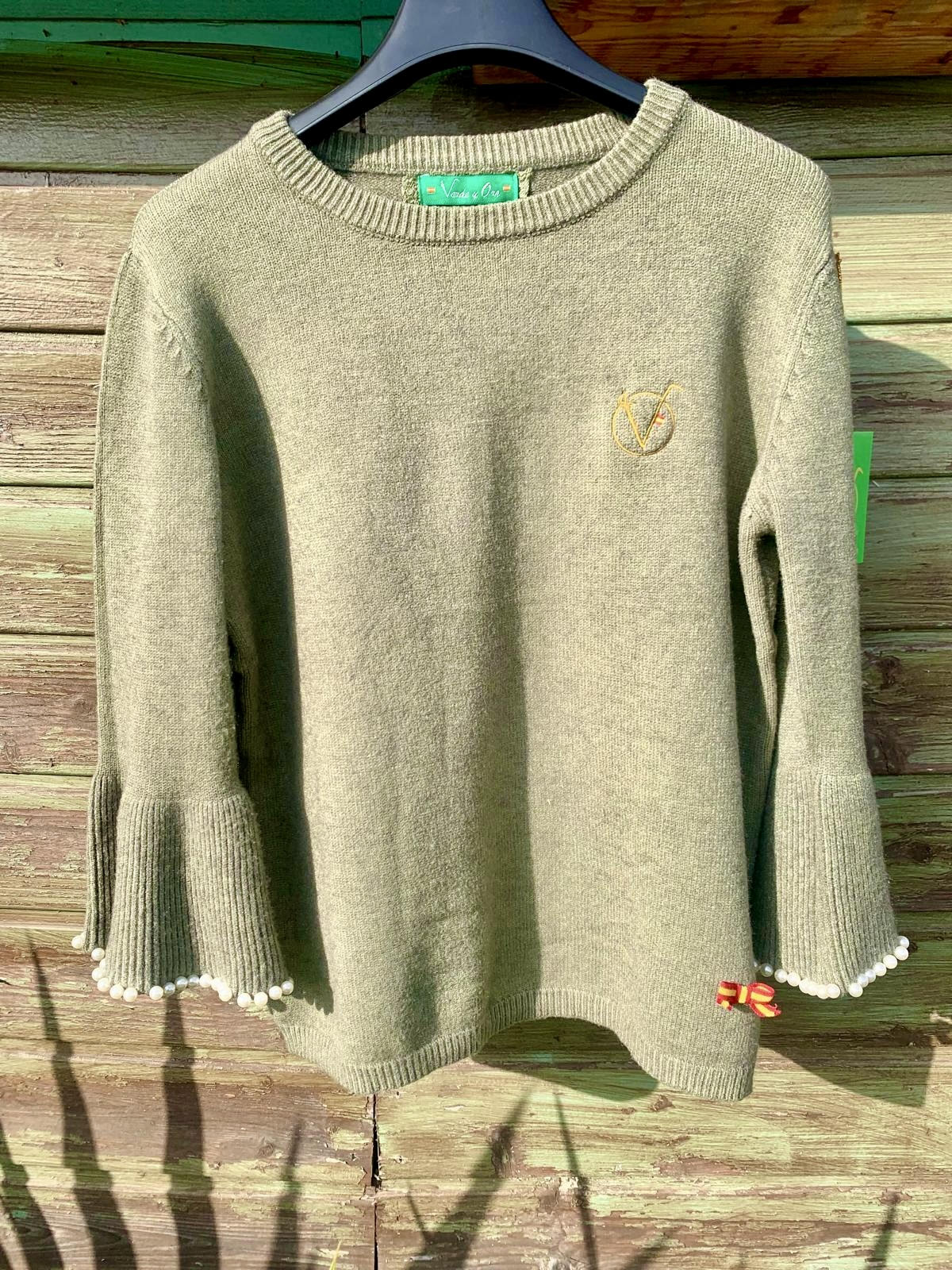 Jersey de punto muy agradable al tacto y cómodo. Logo bordado en el pecho, banderita de España en el bajo y detalle de perlas en los volantes de la manga. 60% viscosa/30% poliéster/10% elástico