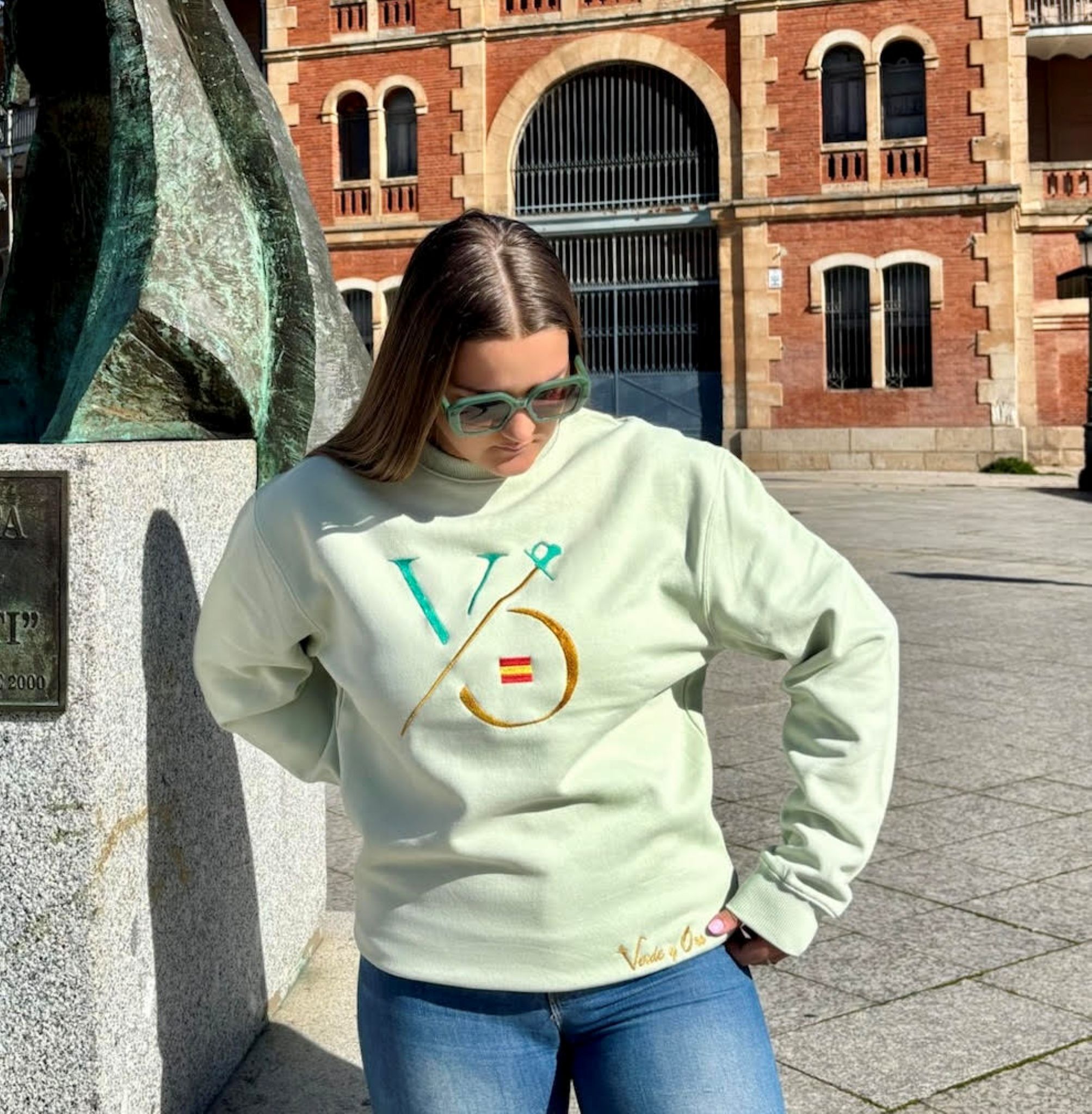 Sudadera en color verde agua con logo delantero bordado, Verde y Oro, Versión Original.
