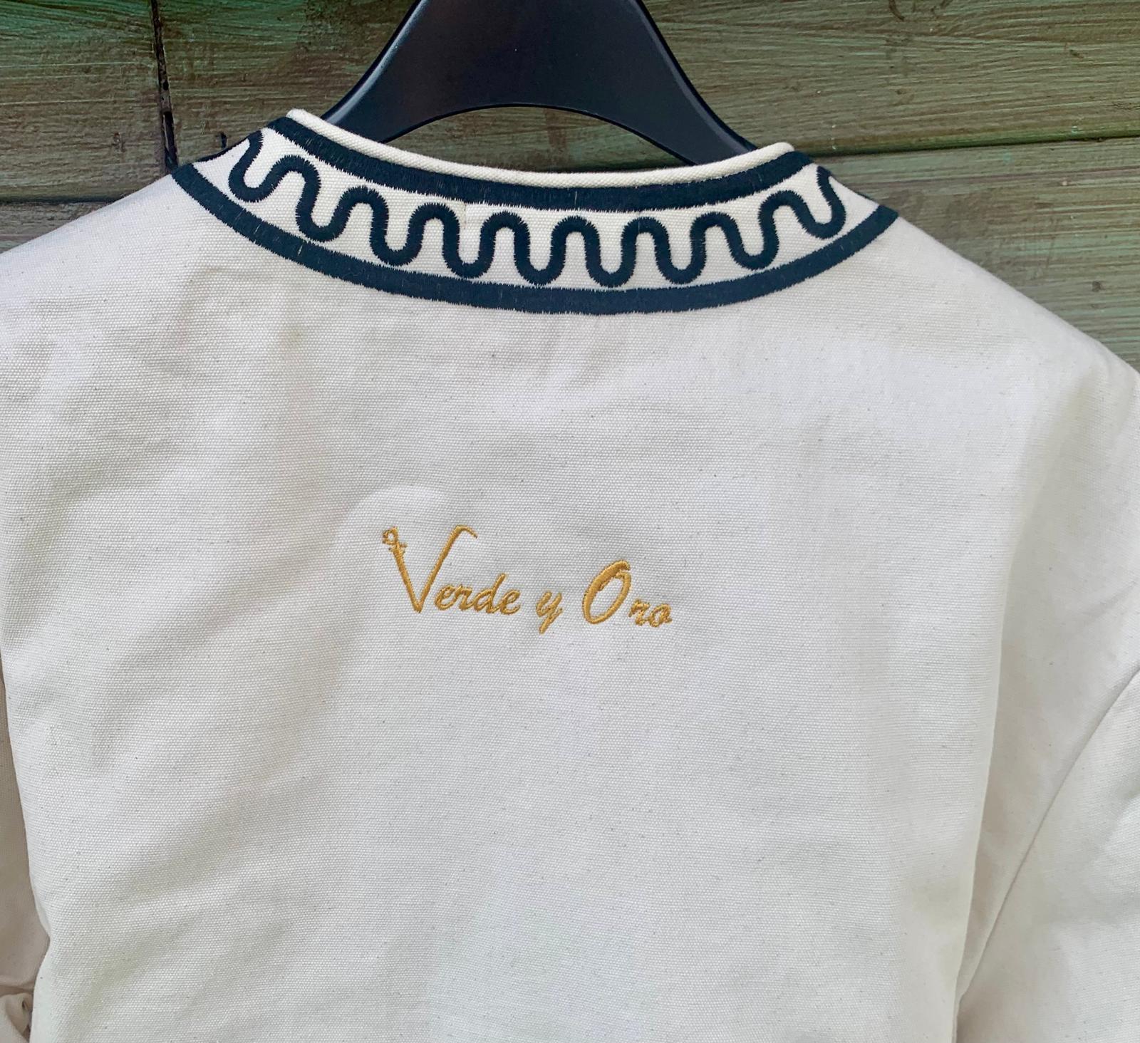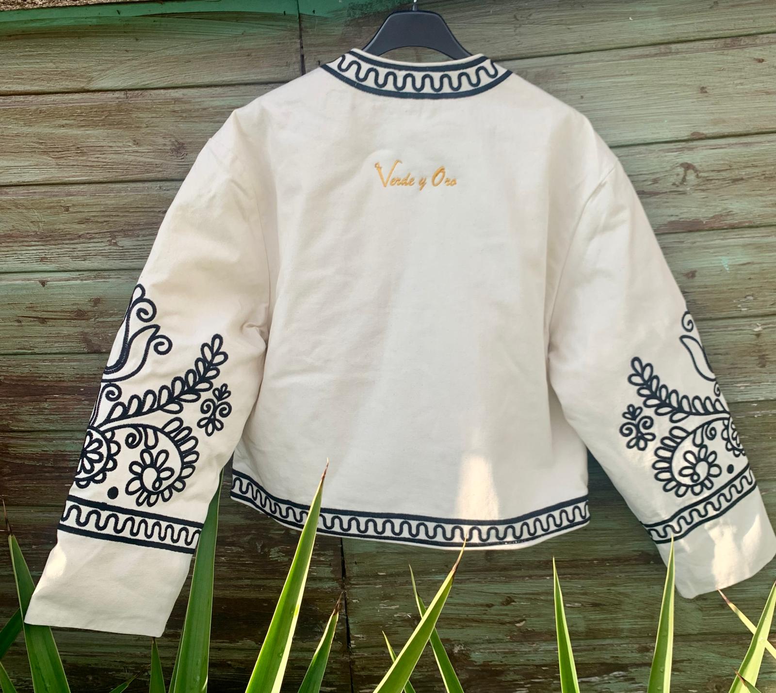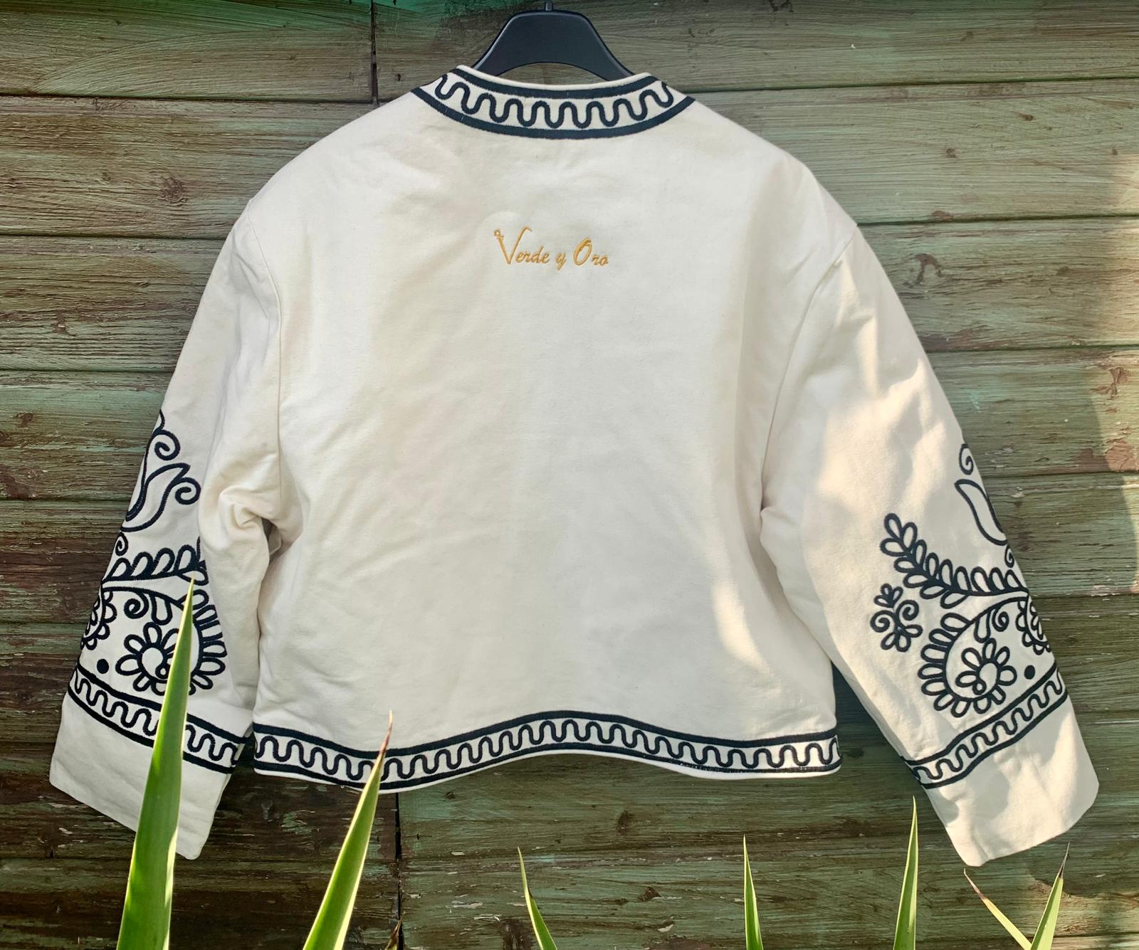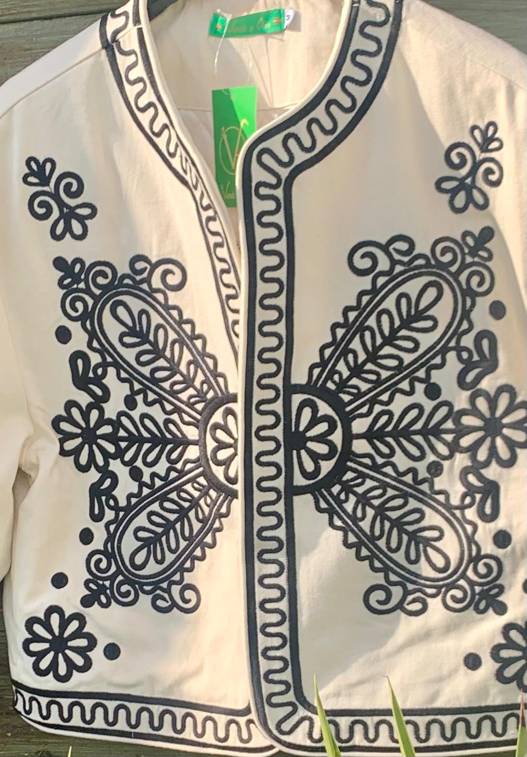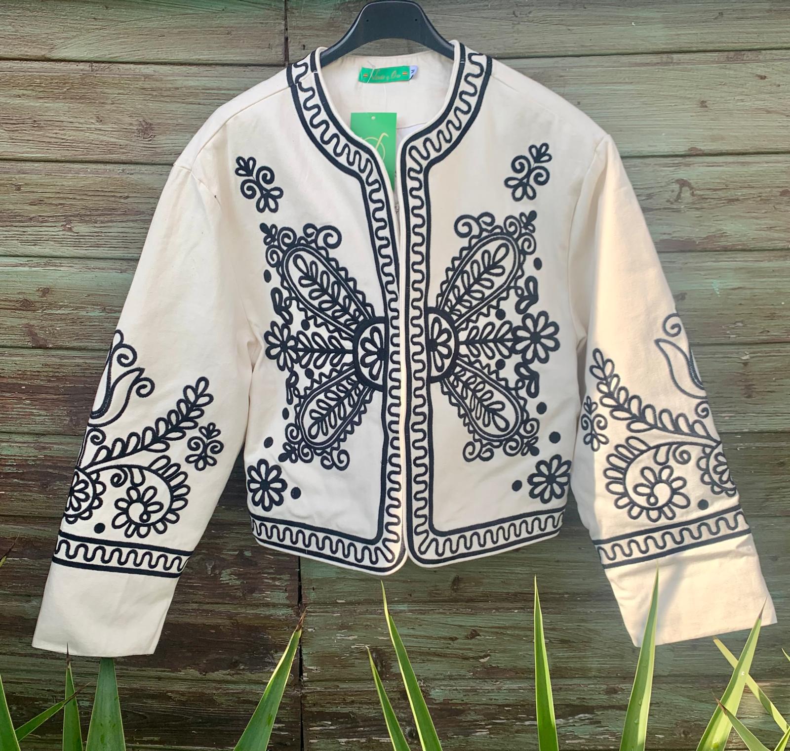 Chaqueta tipo torera bordada con elegantes motivos en negro.